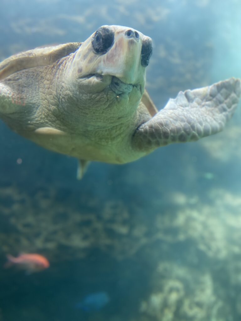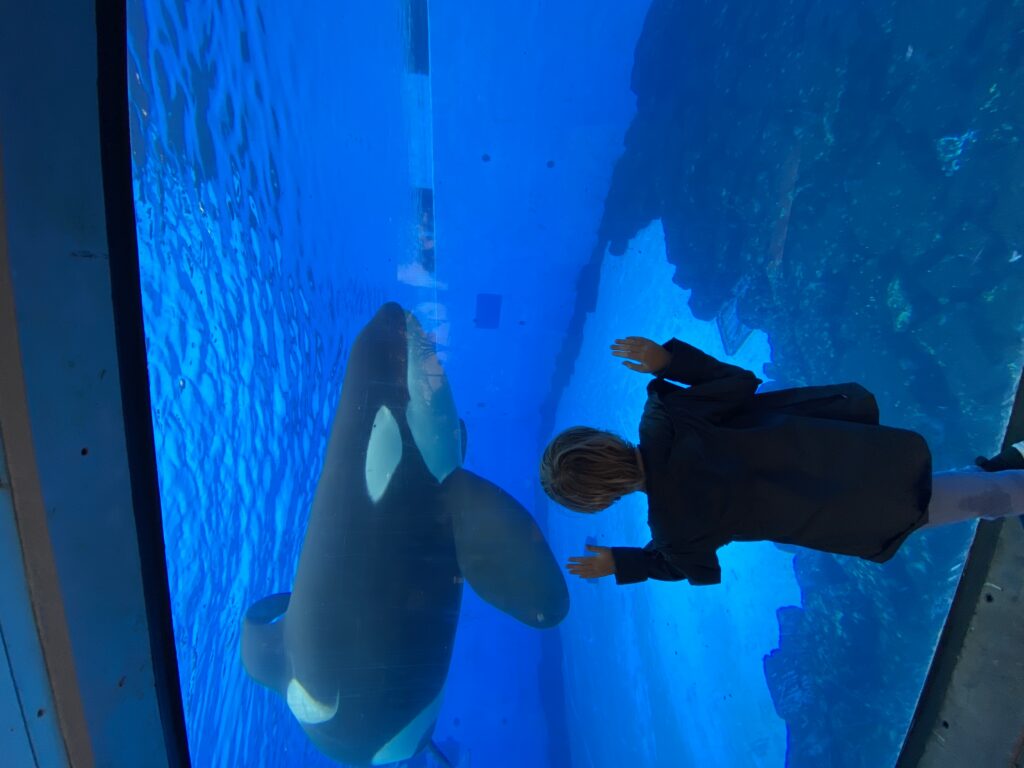 We went directly to Dolphin Cove to watch the trainers (and our friend, Allison) show off the Dolphins. They have a total of 48 dolphins within the facility. There was a narrator (but with a mask and from our perspective, she was hard to understand) but that didn’t stop us from absolutely enjoying the show!
