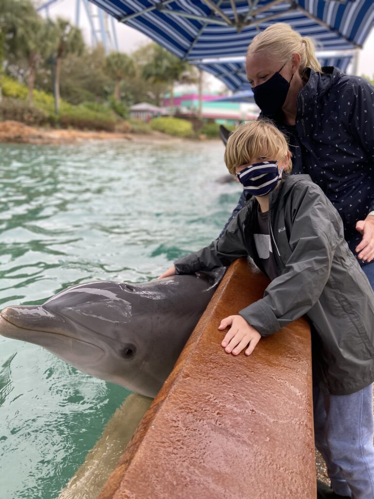 We were so excited to have the opportunity to visit SeaWorld Orlando! I read how it was a newly Certified Autism Center and wanted to learn more about what that looks like in person. So we tacked this visit to the beginning of our Mom and Son Disney trip! We were incredibly lucky to have a childhood friend of mine, who just happens to be a Dolphin Trainer (EEK!!) at SeaWorld, make our visit even more magical.